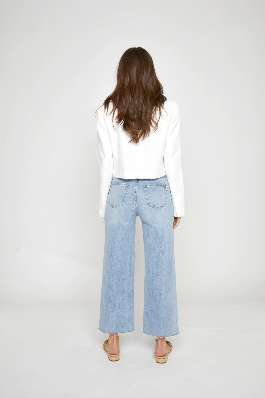 The Fit: High rise, fitted through the hip, zipper fly, wide leg, and a cropped raw hem. The Feel: A structured cotton blend with enough stretch to hold you in while molding to your body over time.