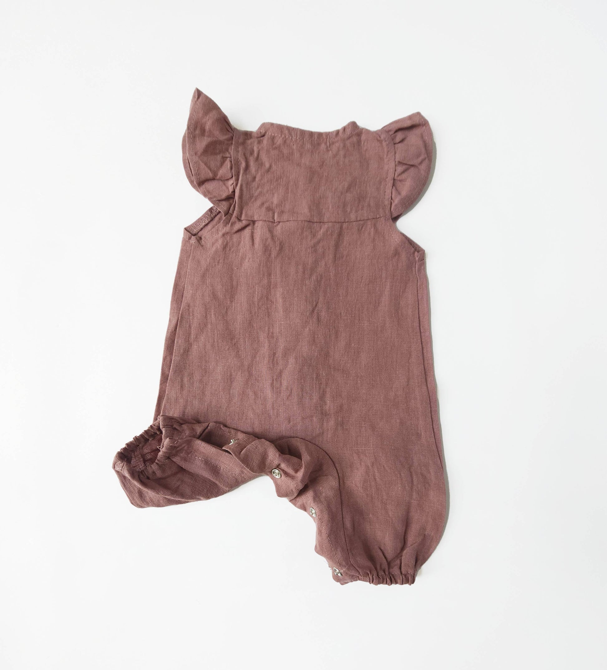 Details: Short Sleeve design perfect for warm days Ruffle sleeves for a charming touch Functioning Wooden Buttons on the front Leg Snaps for easy diaper changing