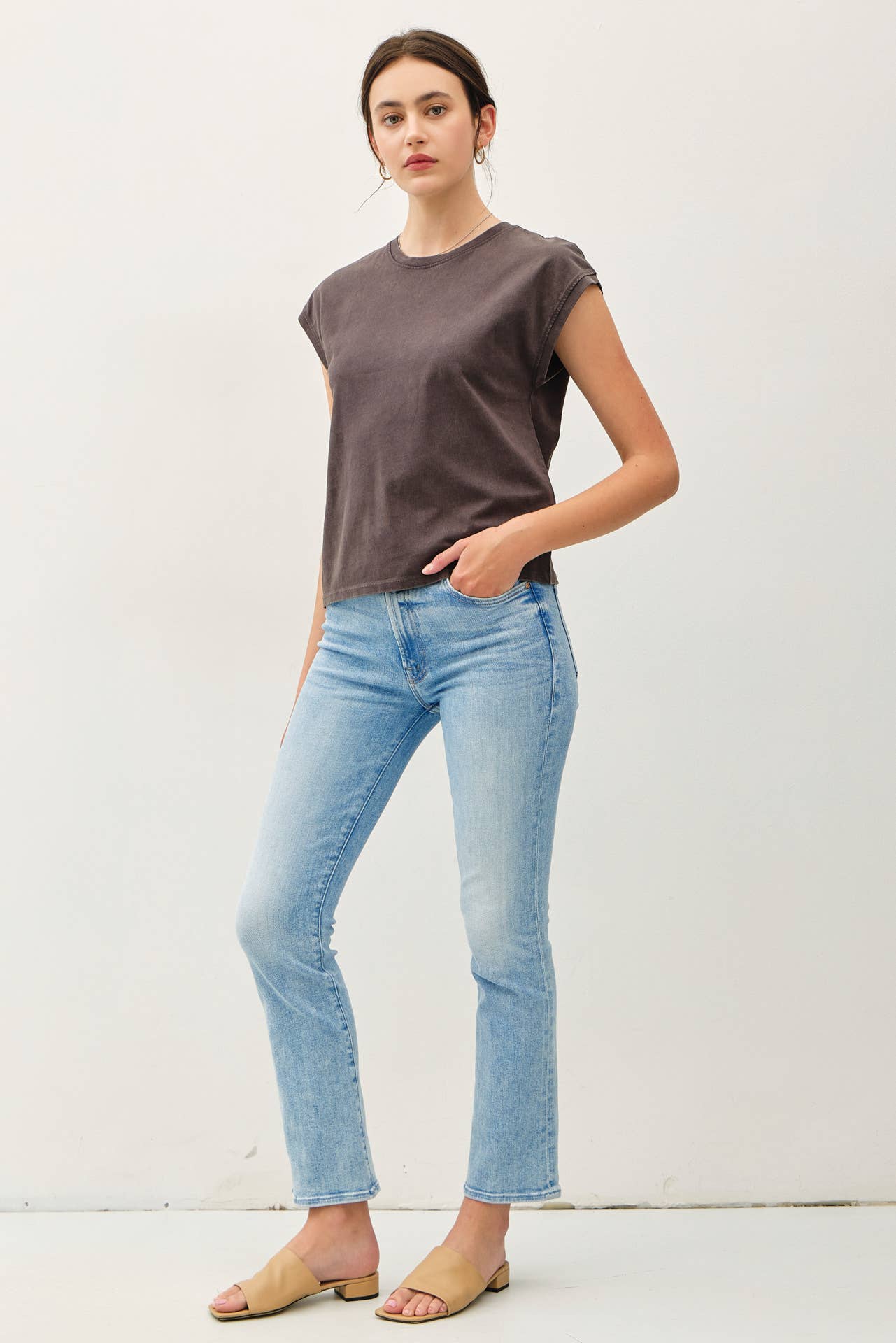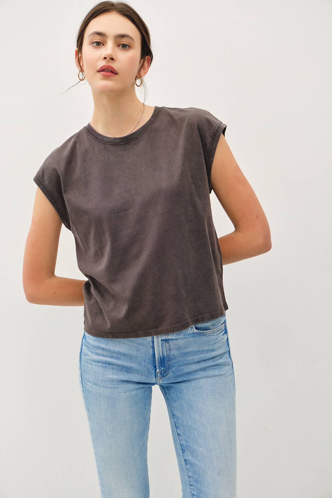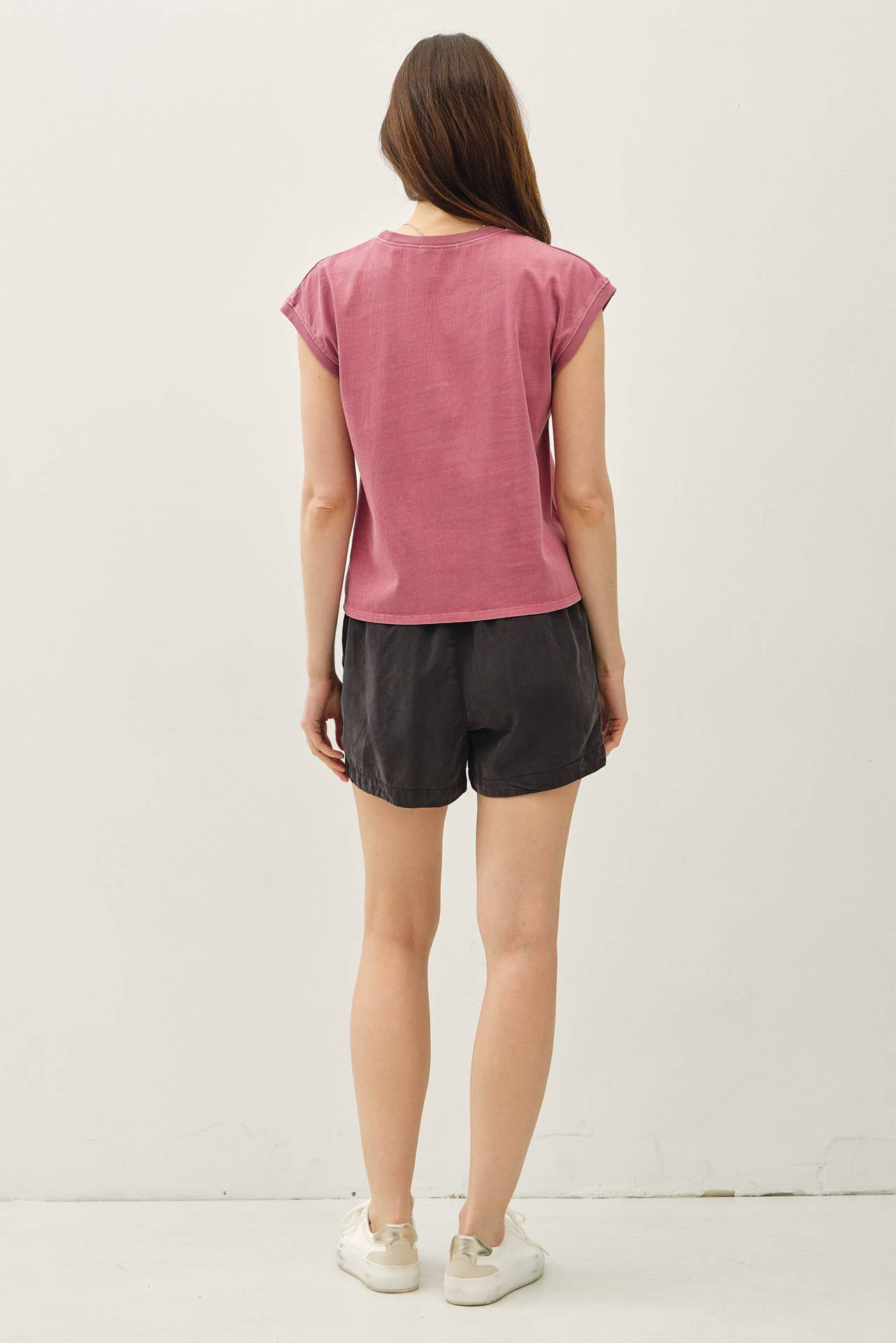 This playful acid wash tee features capped sleeves and a round neck for easy, breezy style. Its relaxed fit and cropped length make it perfect for casual days, while the pullover design keeps it simple and comfy. Add a splash of vintage vibe to your everyday look with this fun, laid-back essential.