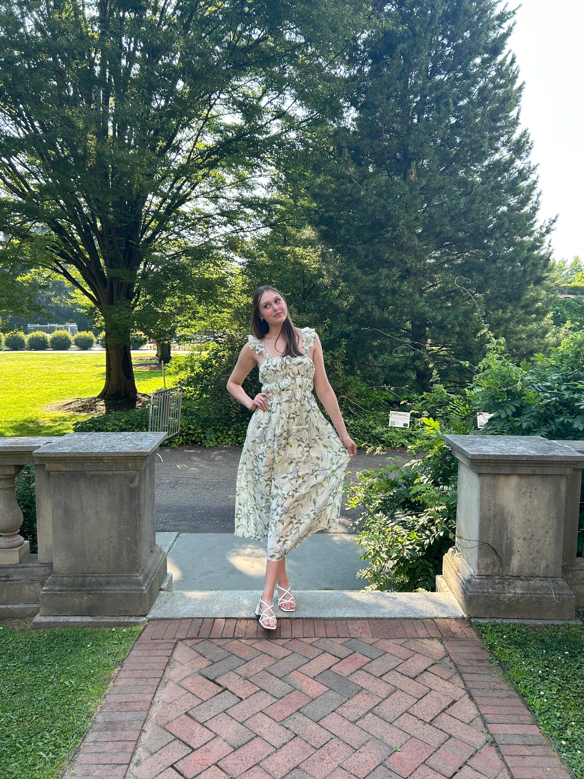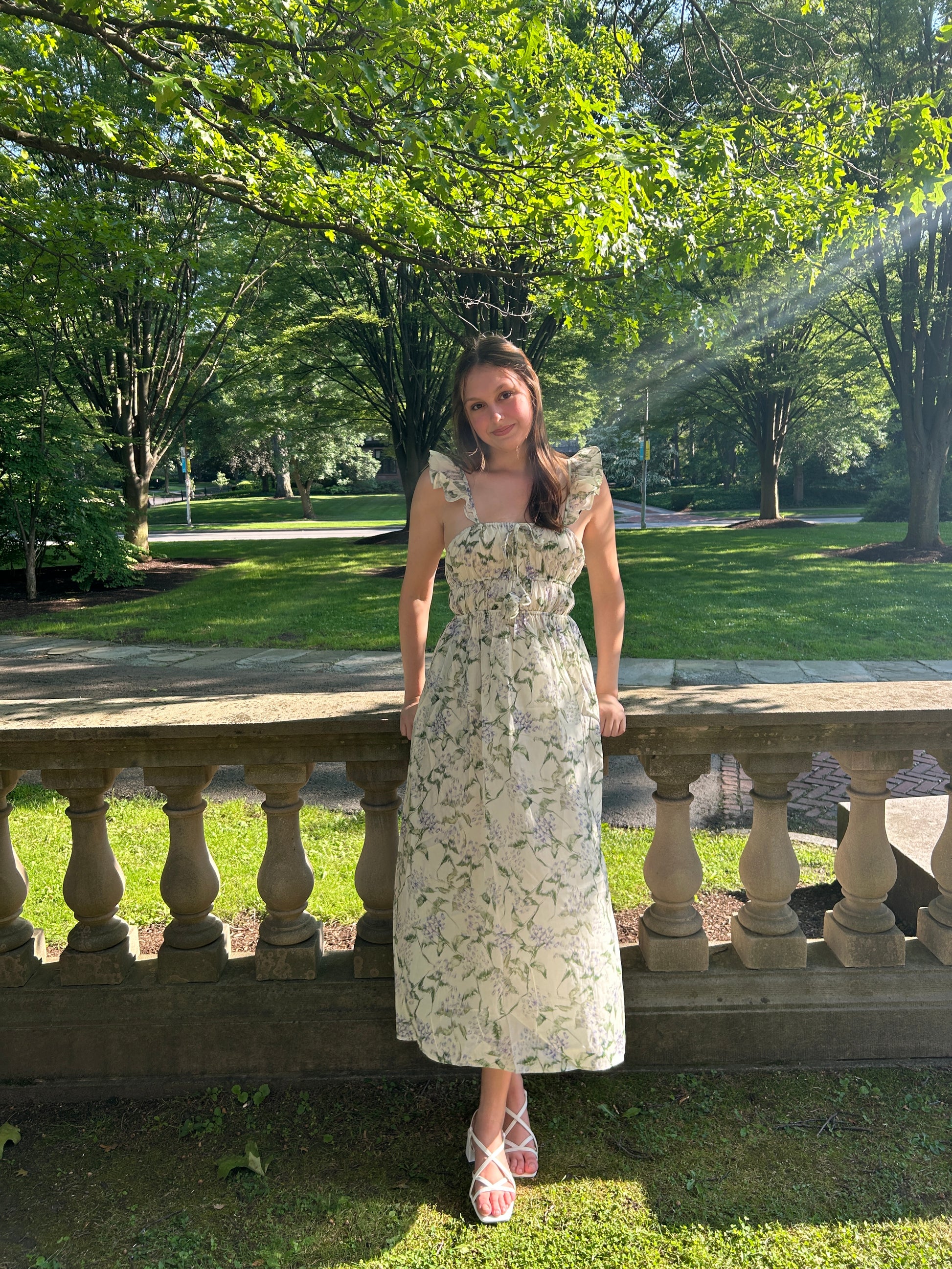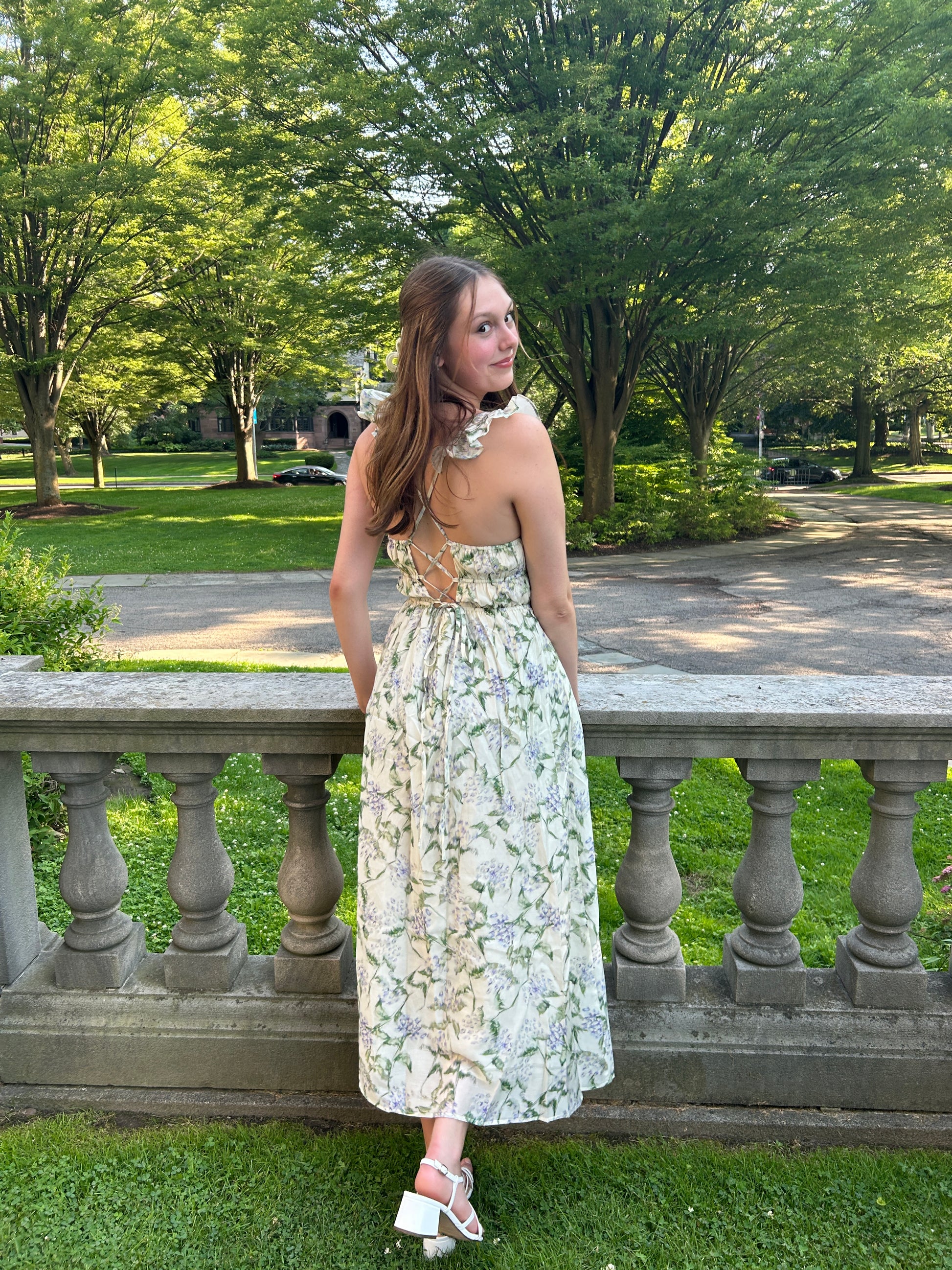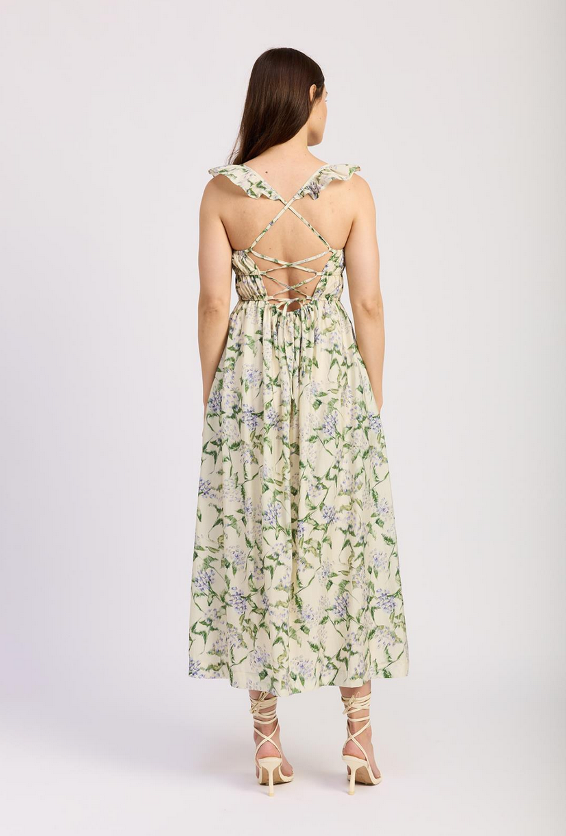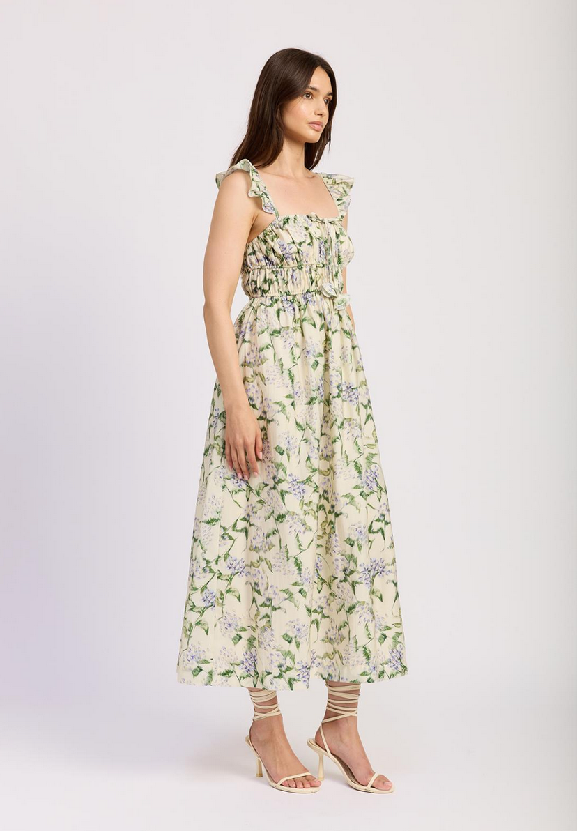 The Charleston Maxi Dress brings a playful touch to your wardrobe with its vibrant floral print and charming ruffle sleeves. The delicate back detail adds a flirty twist, making it perfect for sunny days and casual outings. Light and breezy, this dress combines comfort with a fun, feminine flair.