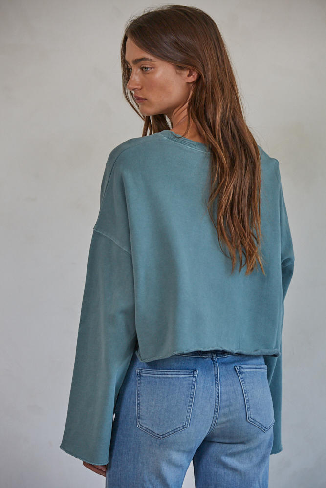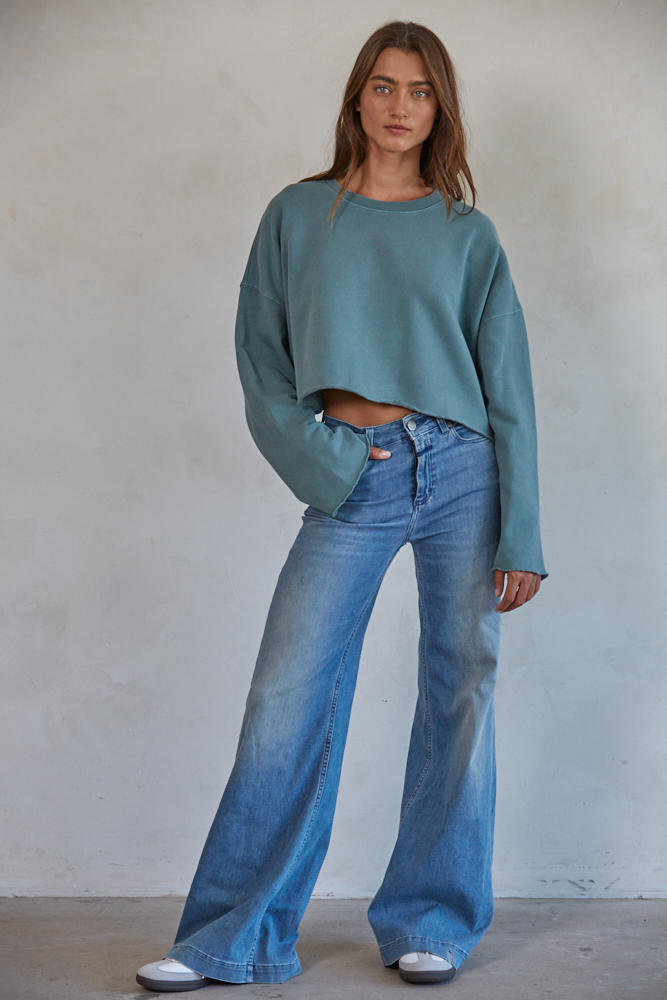 Stay cozy and stylish in the Delilah Short Cut Pullover. Made from 100% cotton, this crew neck pullover features long bell sleeves and a cut cropped waist for a comfortable and trendy look. Perfect for pairing with high-waisted bottoms for the perfect fit.