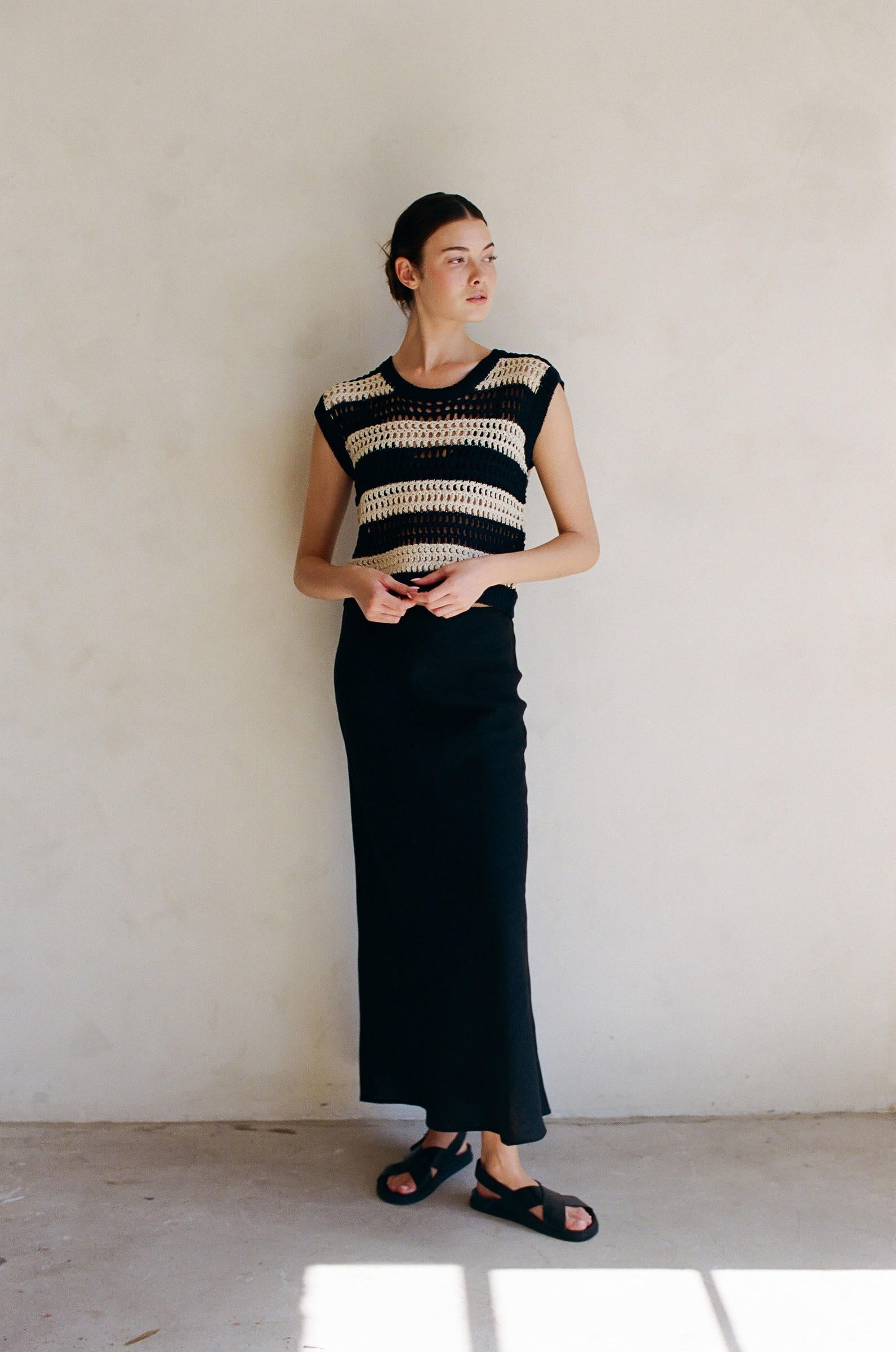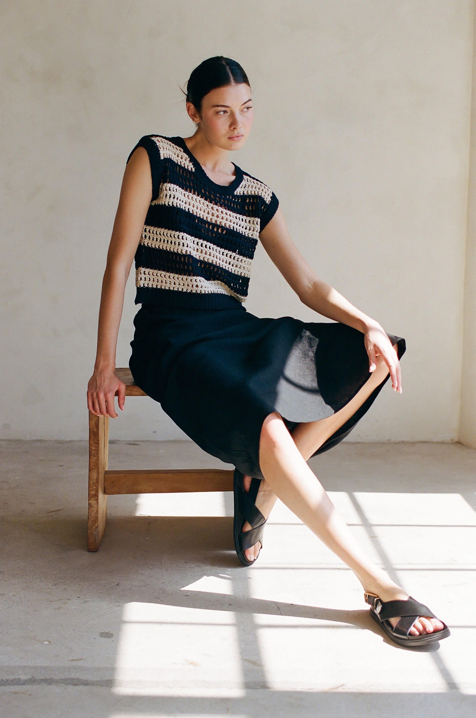 Introducing the Dylan Stripe Sweater Top - a knit sweater that offers effortless luxury and elegance. The stripes and see-through design add a touch of sophistication, while the round neck and cap sleeve provide comfort and versatility. Polished, timeless style are met with this must-have pullover top.