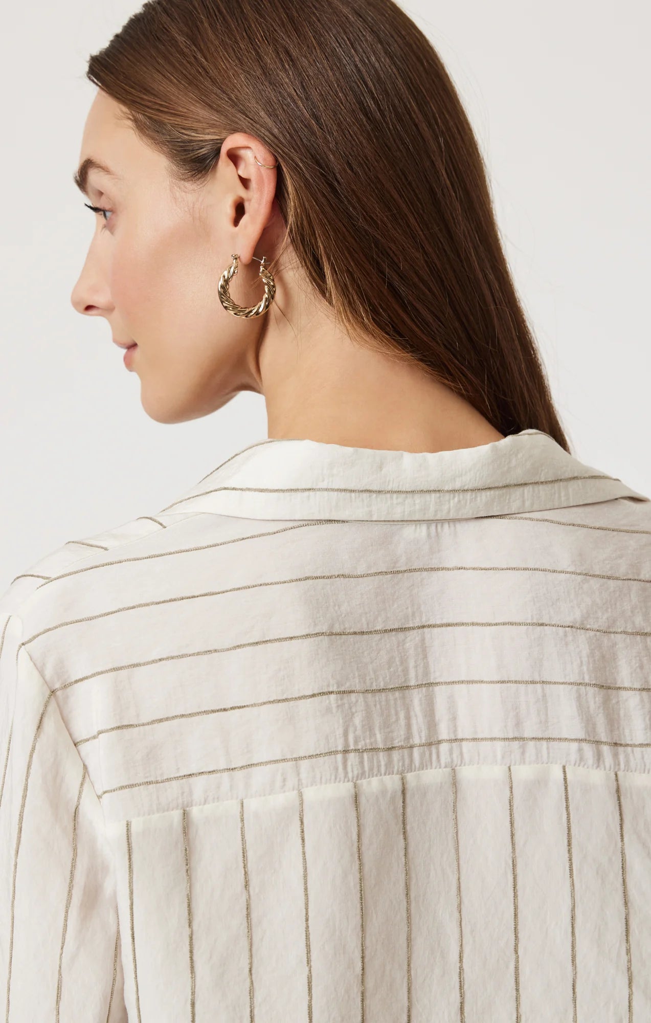 Check out our Ginny Pocket Long Sleeve Button Down - the perfect blend of sophistication and fun! This button-up shirt comes in a sleek khaki color with a timeless black vertical stripe, but the real showstopper is the playful horizontal pattern on the pocket and sleeves. Trust us, you'll be turning heads in this unique piece.