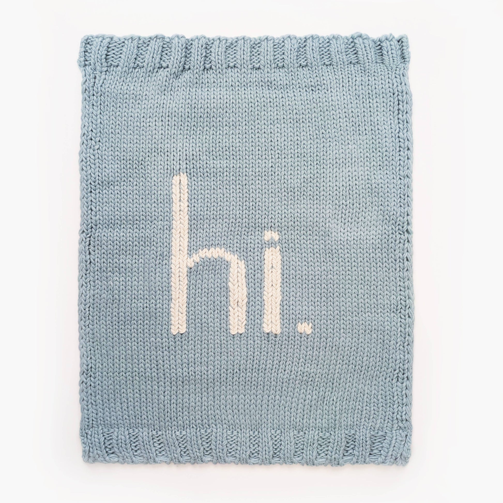 Welcome the little one with this adorable surf blue Hi. Hand Knit Baby Blanket! Hand knit from soft Icelandic Acrylic yarn, it features the word "hi." stitched twice in a natural yarn color. Perfect for those first hospital moments and photos, it also makes a charming baby shower gift.