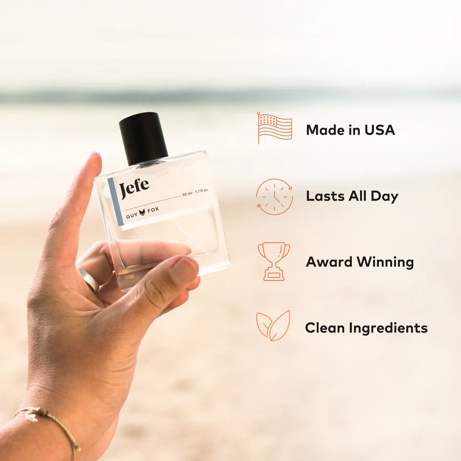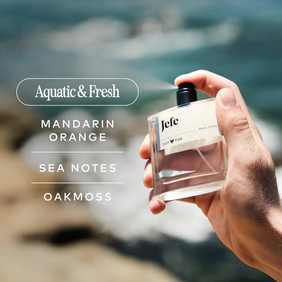 A uniquely modern twist on a traditional masculine scent and the most distinct fragrance of the GUY FOX collection. Jefe features leading notes of Oakmoss and Mandarin Orange with an added marine layer thanks to the Sea Notes. Let our best-selling fragrance transport you to the best nighttime beach party of all time. Jefe was made to be the biggest people-pleaser scent and has exceeded all expectations. You'll feel confident wearing this fragrance in any season, for any occasion. And when people ask what you're wearing, it's pronounced "hef-ay".