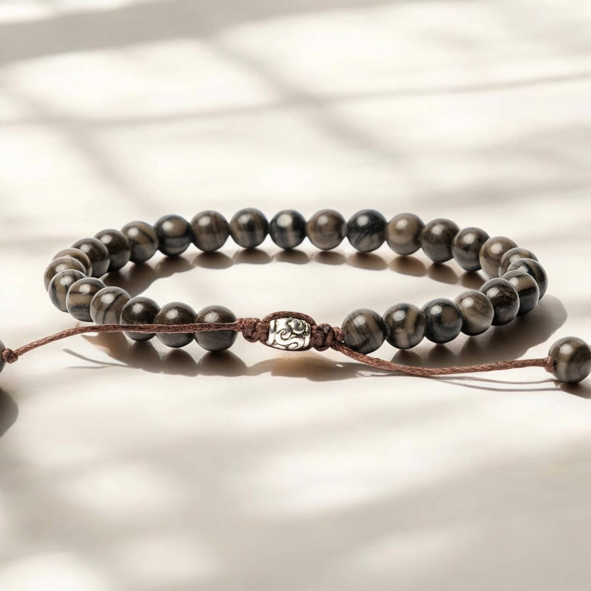 Our men's Black Jasper Bracelet features jasper, a stone known for its protective and healing properties. It promotes relaxation, reduces fears and uncertainties, and helps the wearer achieve a sense of tranquility and balance. Artfully pieced together with genuine care, this bracelet carries the warmth of handmade craftsmanship straight to your wrist.