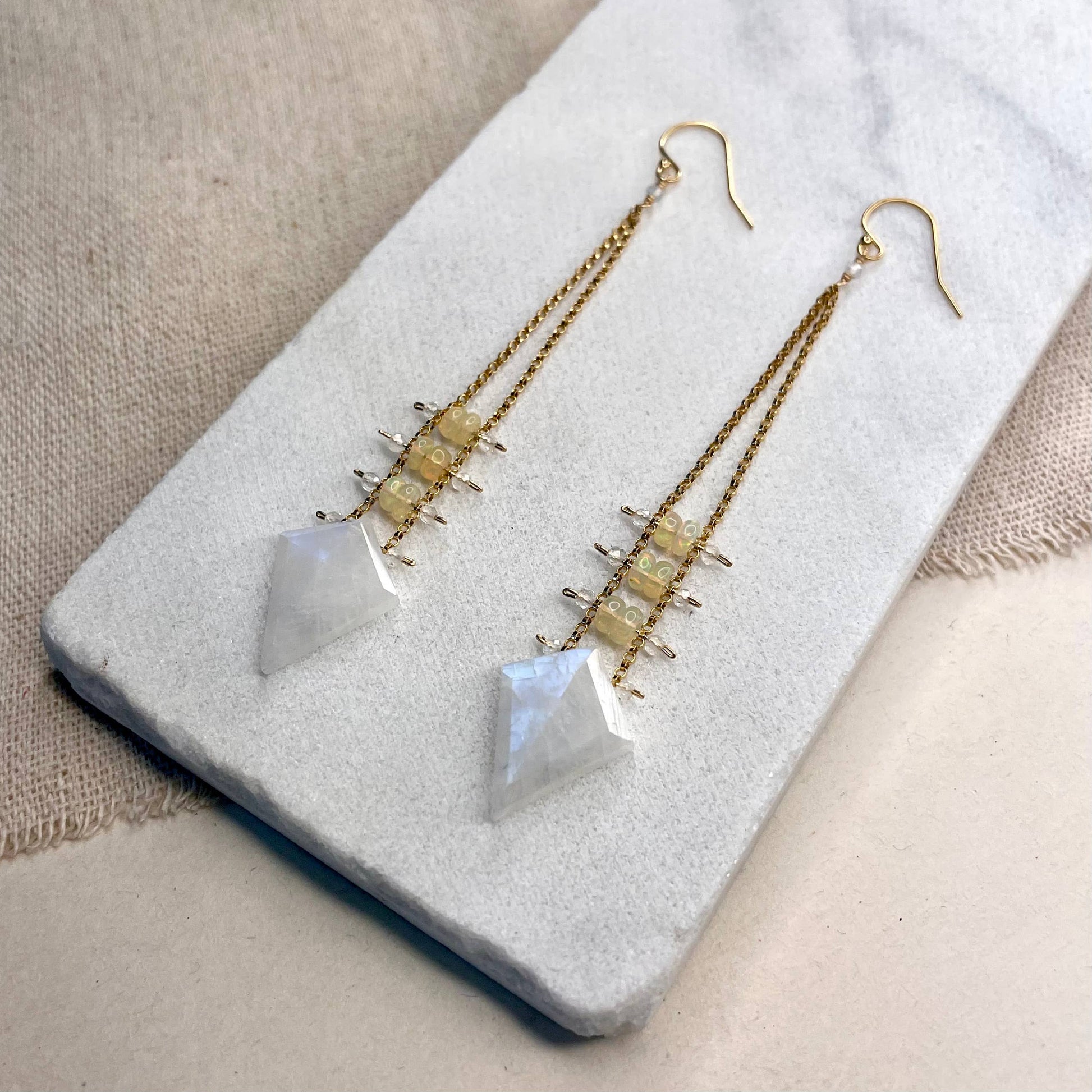 Our Moonstone Ladder Earrings are the accessory upgrade you've been waiting for. Handcrafted with intention, each pair showcases a faceted kite-cut moonstone gracefully suspended on delicate 14k gold-fill chain, finished with luminous opal and clear quartz accents. At approximately 4 inches long, they're the perfect statement length without compromising comfort. Designed for real life, these earrings are waterproof, sweat-proof, and hypoallergenic—plus, they're completely free of lead and nickel. From morning meetings to evening adventures, choose them with confidence knowing you're wearing jewelry that's as durable as it is beautiful.