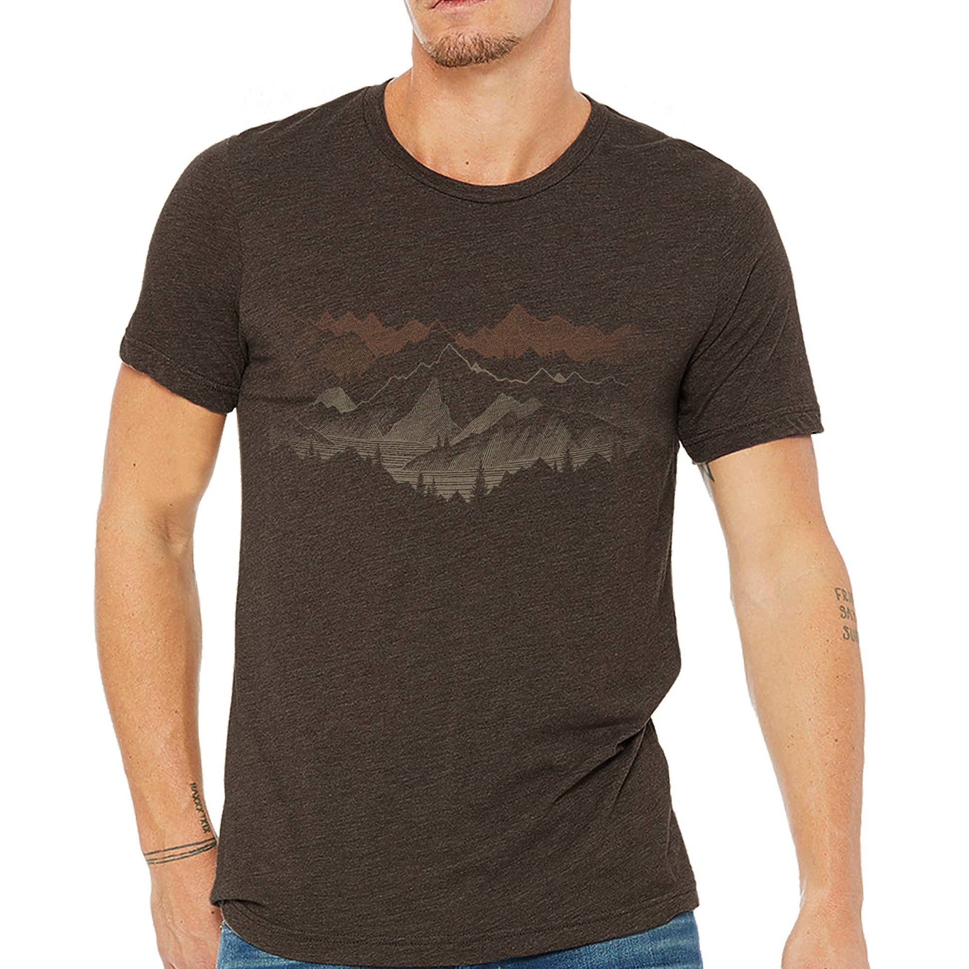 Designed for those who crave the call of the wild, our Mountain Standard tee—Edition 1—shows off a hand-drawn mountain range with intricate linear details. Printed in warm tan and clay hues, it pairs beautifully with the rich brown, soft, and lightweight fabric. Made from a comfy 60/40 cotton-poly blend, it’s perfect for trailblazing or chilling by the campfire. Featuring eco-friendly inks, a tagless neck label, and a pre-shrunk fit, this tee is a cozy, nature-loving companion for every adventure.