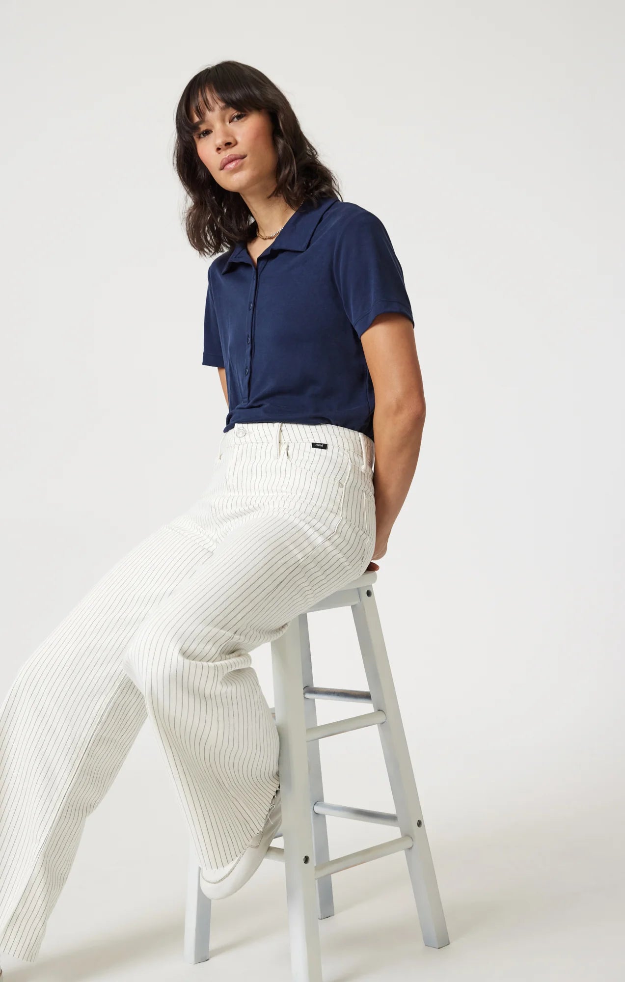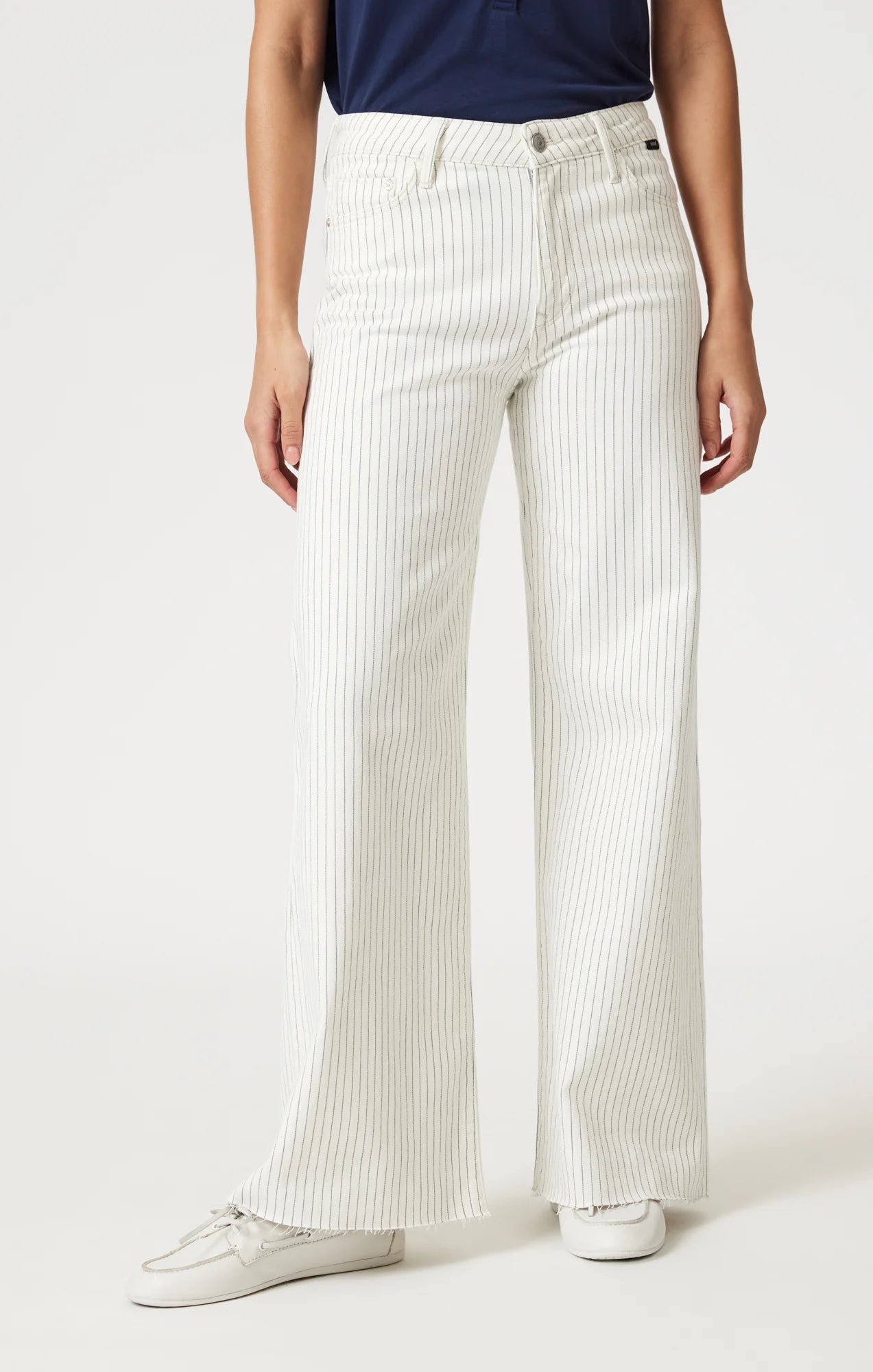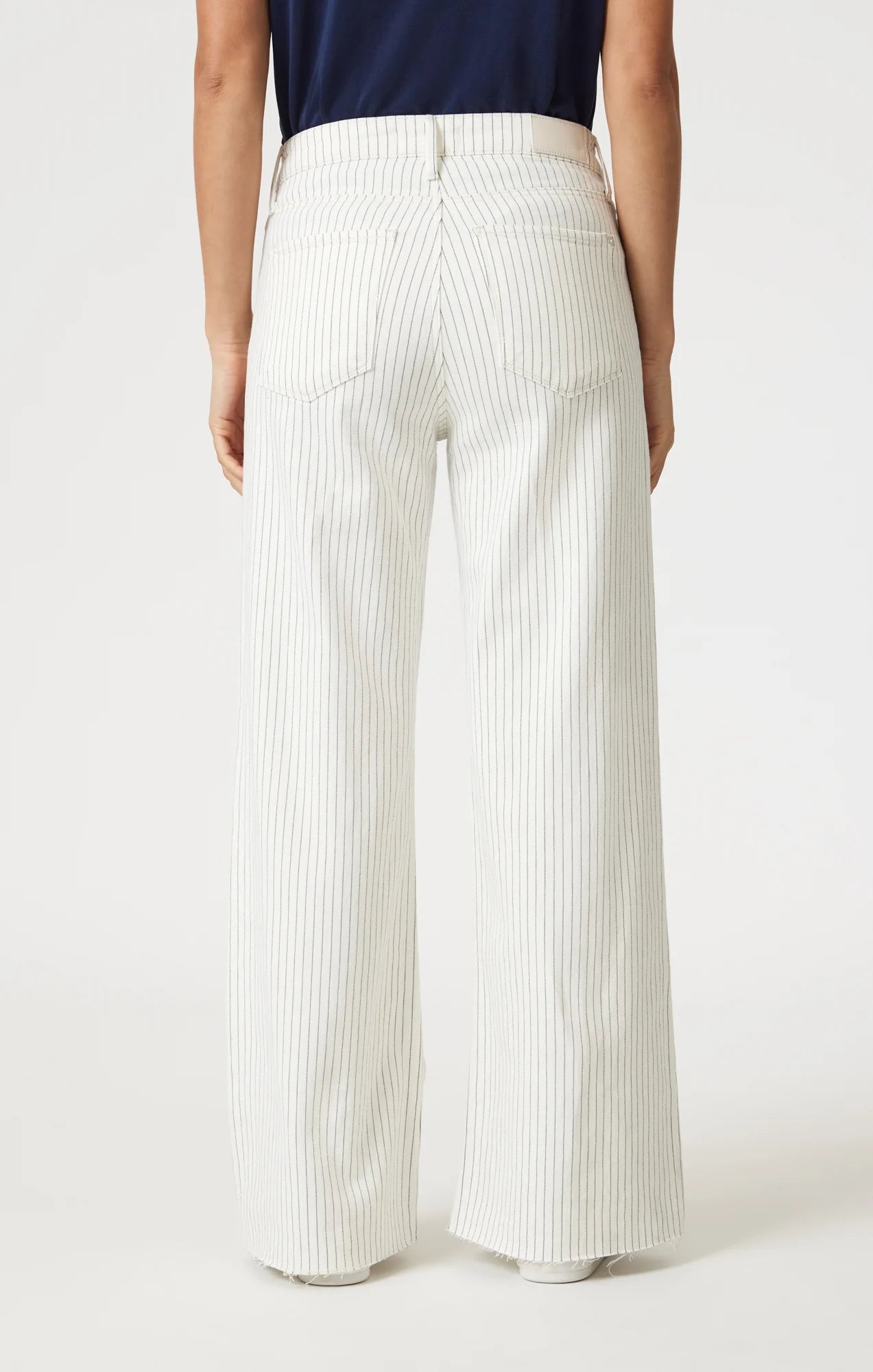 Embrace comfort and style with Paloma, our flattering wide-leg fit denim. Finished in an off-white wash with thin stripes, these must-haves are a modern take on a classic pattern. Featuring minimal stretch and an easy-wearing mid-weight feel, this denim fabric has the look of a timeless original you can count on, wear after wear. Step up the style game by pairing with a solid tee or crisp button-down. Go from basic to bold in a snap!
