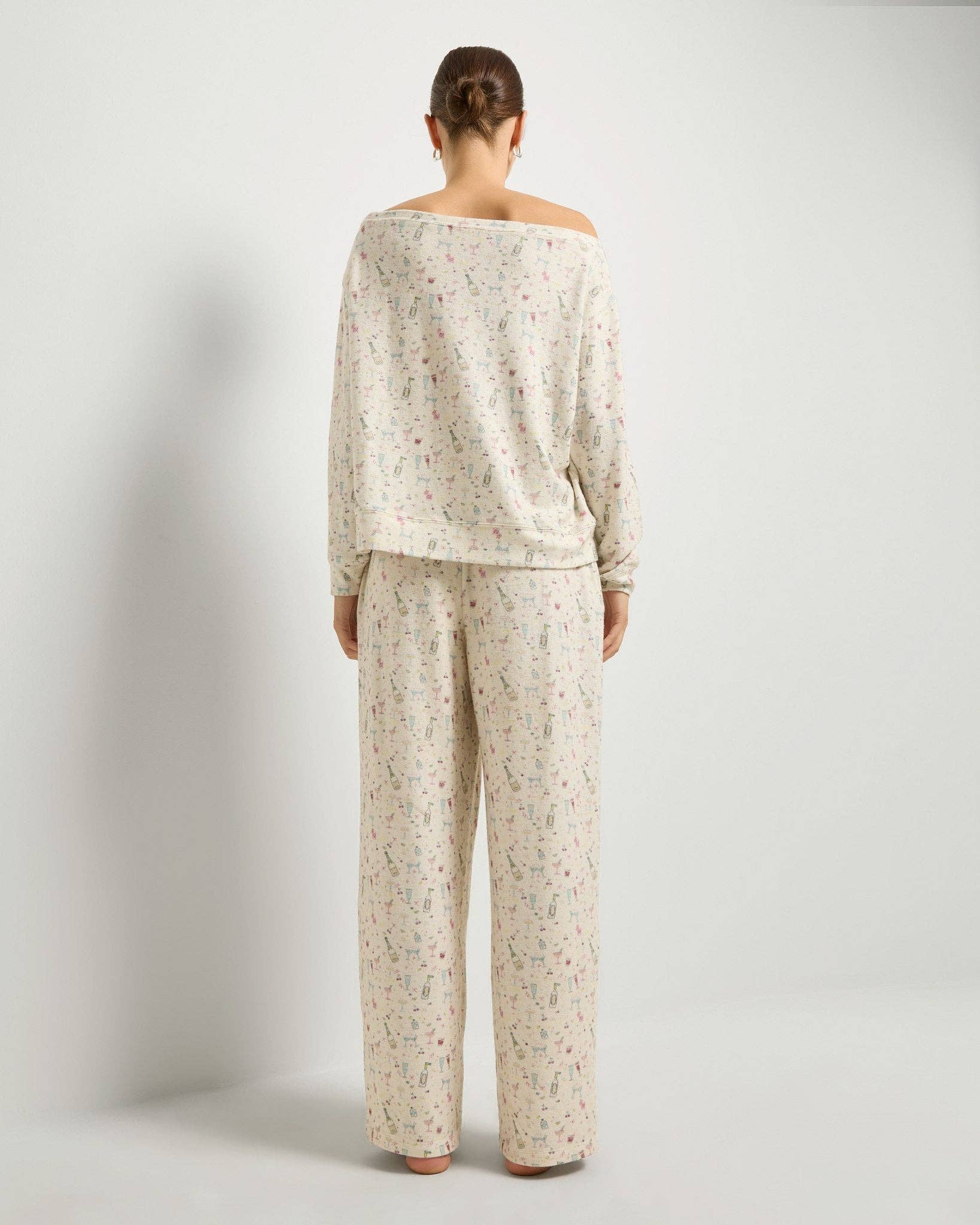 Turn downtime into pure joy with the Tracy Sleep Set—your new favorite excuse to stay cozy. The top flaunts a clever dual-wear neckline that shifts from classic boatneck to flirty off-shoulder in seconds, while the breezy wide-leg pants deliver comfort with practical side pockets and an easy-adjust drawstring. Crafted from soft, lightweight hacci knit, this 29" inseam pair hugs you just right. The real showstopper? A cheeky champagne and cocktail print bursting with bubbly vibes and festive doodles—because lounging should always feel like a celebration.