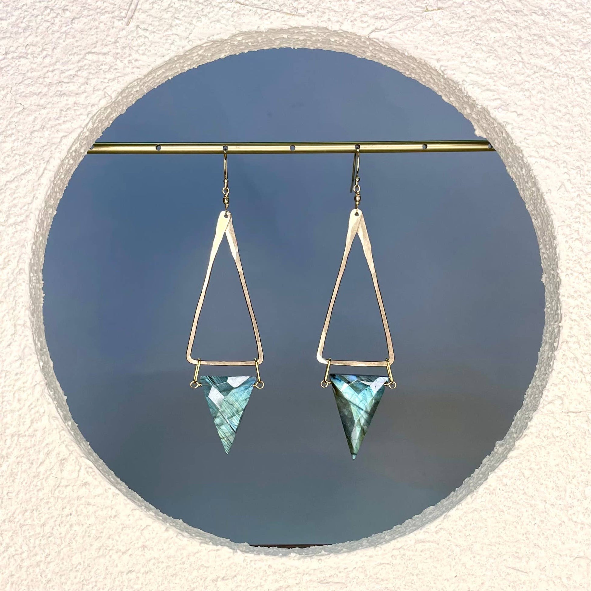 Fall in love with our Triangle Stone Drop Earrings! Each pair features a meticulously hand-hammered triangle paired with a luminous labradorite stone, creating an eye-catching shimmer that elevates any look. At 3.5" long, these earrings seamlessly blend practicality and beauty—they're waterproof and sweat-proof, so you can wear them confidently anywhere. Crafted with care from hypoallergenic materials and completely free of lead or nickel, they're gentle on sensitive skin.